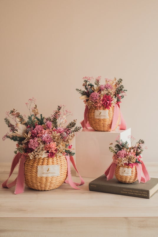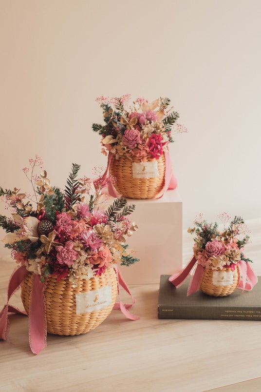 Flower BAG No.2 /カゴバッグアレンジ ロージーシュクレ/ドライ・プリザーブドフラワーガーリーなローズピンクをメインに、プラチナのワタカラやユーカリがきらりと光る特別なデザイン。