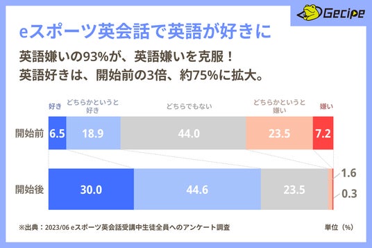 多くの会員さまより「楽しみながら学べる」という声が寄せられており、データとしてもその効果が裏付けられています。「英語が嫌い」「どちらかというと嫌い」という回答が受講前では約30%に達していたのに対し、受講後にはその割合が約2%にまで減少しています。このデータからも、eスポーツを活用した学習が、苦手意識の克服に役立ち、楽しさを感じながら英語力を向上することにつながるとわかります。