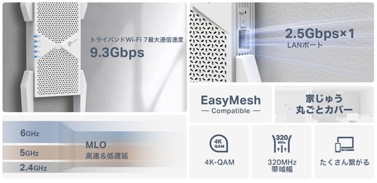 - EasyMesh互換:EasyMesh対応のネットワーク機器と連携させることで、シームレスで柔軟性に富んだ家じゅうをカバーするメッシュネットワークを構築します。