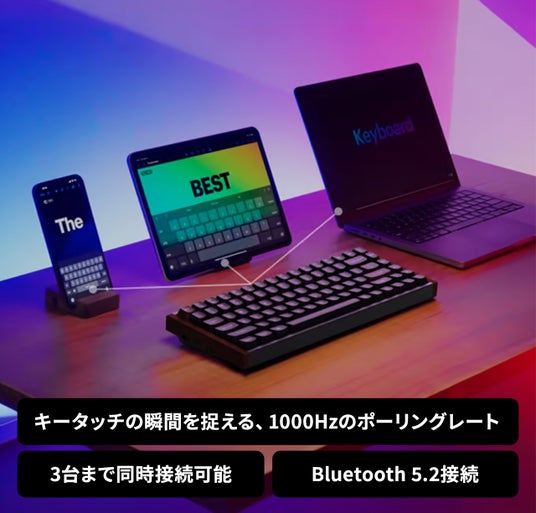 WindowsとMacの両OSに対応し、キーキャップの付け替えも自由自在。さらに、Bluetoothで最大3台のデバイスとペアリングができるため、複数のデバイスをシームレスに切り替えて使用可能です。2.4GHzのワイヤレス接続にも対応しており、高速かつ安定した通信環境を提供します。