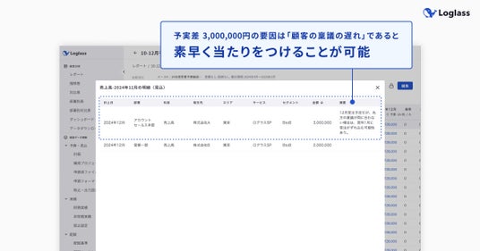 新しいデータ経営の在り方を生み出すDXサービスを提供する株式会社ログラス(本社:東京都港区、代表取締役CEO:布川友也、以下「当社」)は、クラウド経営管理システム「Loglass」にて、計画データ(予算・見込)の内訳である明細データおよび明細データと紐づく補足情報をLoglassの画面上で確認できる「明細ポップアップ機能」を提供開始しました。これにより、予実分析の担当者が、予実差の要因について、素早く当たりをつけることが可能となります。
