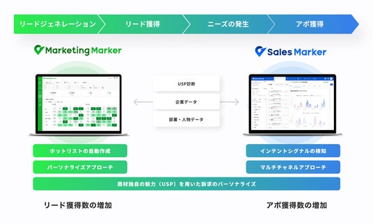 Marketing MarkerとSales Markerという2つの製品を連携させて利用することで、BtoBマーケティングによるリードの可視化とアウトバウンドアプローチ(企業側から働きかける営業手法)による商談獲得の両方で商談機会を最大化し、成約に導きます。両製品は、部署・人物情報のデータベースやUSP(※4)診断データを共有し、より効果的な営業活動と成果を実現します。