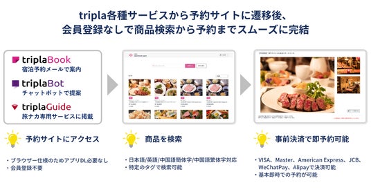 トリプラは、宿泊施設向けのITソリューションを提供する企業であり、国内では約3,000件の多様な規模の宿泊施設にサービスを提供しています。今回の業務提携により、「Japan ticket」が保有する日本国内の飲食店やアクティビティ、観光スポットといった体験型コンテンツを、トリプラが提供するAIチャットボットや宿泊施設の公式サイト、宿泊者への宿泊予約完了メールを通じて案内することが可能です。