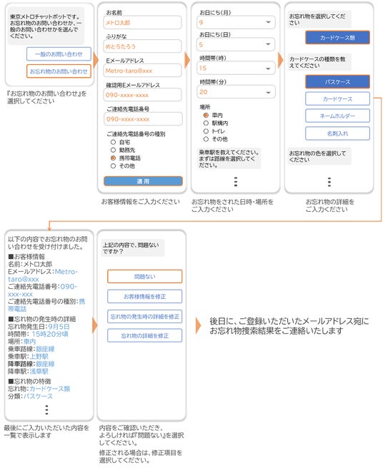 従来、お忘れ物に関するお問合せはメールにて受け付けており、必要な情報を充足させるために複数回の確認が必要となる場合がありました。今後は、チャットボットを通じて、お忘れ物の種別に合わせた必要な情報を会話形式でご入力いただけるようにし、お客様の手間を軽減いたします。