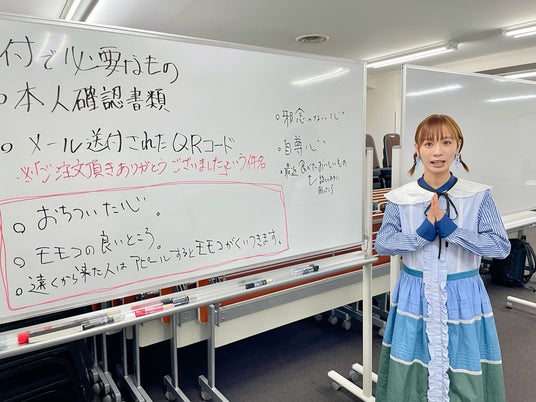 東京のお渡し会では、「落ち着いた心」「モモコの良いところ」などをホワイトボードに書き、緊張感のあった会場を和やかな雰囲気にする場面もありました。