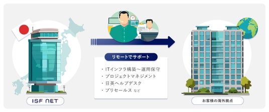 本サービスは、海外に拠点をもつ日系企業のIT業務を、アイエスエフネットが日本から遠隔で支援することで、エンジニアの単価が高い海外に比べて安価で、日本企業のご要望に沿ったビジネススタイルや言語によるサービスを提供いたします。現在は、アメリカ、イギリス、フランス、ドイツ、シンガポール、オーストラリア、韓国、中国を中心にサービス拡大を目指します。