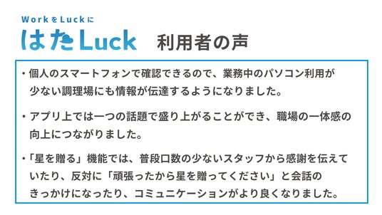 「はたLuck」は、サービス業の生産性とエンゲージメントの向上に必要な機能を搭載しており、全国の外食・ホテル・ショッピングセンターなど幅広いサービス業の職場に導入されています。
