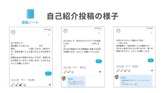 シフト勤務のため従業員が一堂に会する機会が少ない中、感謝を伝える「星を贈る」機能の利用により従業員間のコミュニケーションが今まで以上に活発になりました。また、情報共有用の「連絡ノート」機能を活用して新規採用者が自己紹介投稿を行ったところ、職場の一体感醸成につながっています。
