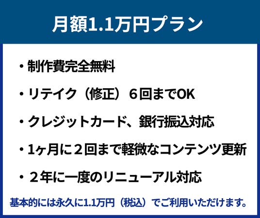 - 月額1.1万円(税込)で、ウェブサイト制作から運営までのすべてをサポート。