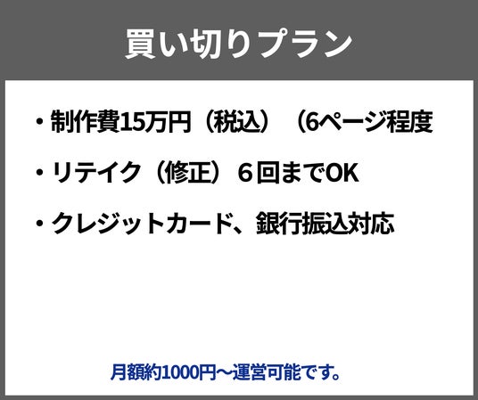 - 一括料金15万円(税込)で、6ページ程度のウェブサイトを制作。