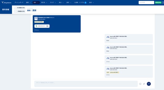 チャット機能Anymore施工管理のチャット機能は、案件に紐づけて案件の参加メンバー間でチャットで会話をすることができます。チャットでメンションがあった場合にはLINEからも確認できるため、現場での見落としも防ぐことができます。
