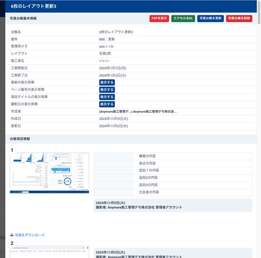 写真・資料管理機能Anymore施工管理は、写真、資料を管理する機能を提供しています。写真管理機能では、PCやスマートフォン、LINEから登録された写真を案件に紐づけてフォルダごとに管理でき、登録された写真から簡単に工事写真台帳を作成することができます。