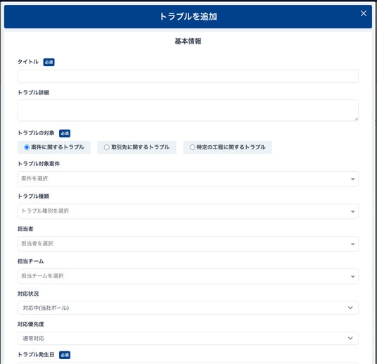 トラブル管理機能Anymore施工管理の特徴の一つがトラブル管理機能です。現場で発生したトラブルや事故、ヒヤリハットの情報をトラブルとして案件に紐づけておくことで、誰でも、どこからでもトラブル情報を参照することができます。また、類似の工事が発生した際には、過去に発生したトラブルがLINEで通知されるので、新しい担当者でも過去に発生したトラブルの内容を考慮した施工が可能です。