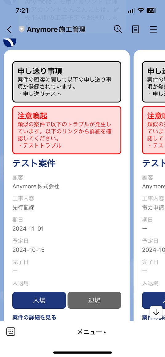Anymore施工管理の特徴的な機能は「LINE連携機能」です。LINE連携機能を使えば、全てのユーザーが自らの担当する現場の情報がLINEで届き、LINEのメッセージから入退場の登録や、写真の登録、報告作業を実施することができ、誰でも、簡単に利用ができます。