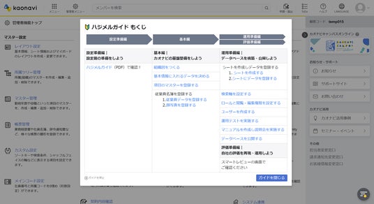 当社が提供する「テックタッチ」は、Webシステムの画面上でナビゲーションを作成・表示することができます。ナビゲーションで「カオナビ」の便利な使い方や、有用な機能を直接ユーザーに案内することが可能です。