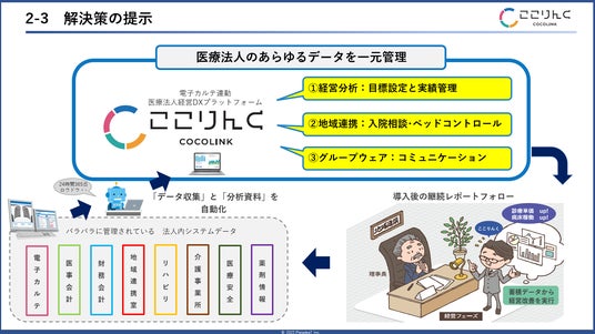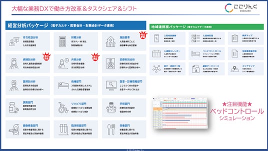 「ここりんく」は医療法人内に散在するシステムデータを統合し可視化するプラットフォームです。電子カルテや医事会計システムなどの情報を自動収集・分析し、部門や病棟単位の日報・週報・月報を自動作成する機能や、サテライト診療所や介護事業所からの情報を収集する機能を備え、日々蓄積される膨大な診療データをタイムリーに経営に反映することが可能です。また、データの可視化だけでなく、地域連携室のベッドコントロール業務のDX化や提携するコンサルタントによる経営支援など、医療法人の経営改善まで結びつけるソリューションの提供により、医療介護事業者様の経営効率化、経営改善をサポートします。