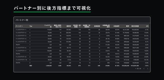 今回のリリースでは、運用型広告だけでなく、アフィリエイト広告におけるインフルエンサー別・メディア別のパフォーマンス可視化、および代理店別のパフォーマンス可視化機能を追加しました。これにより、より広範囲での予算配分の判断が可能となります。