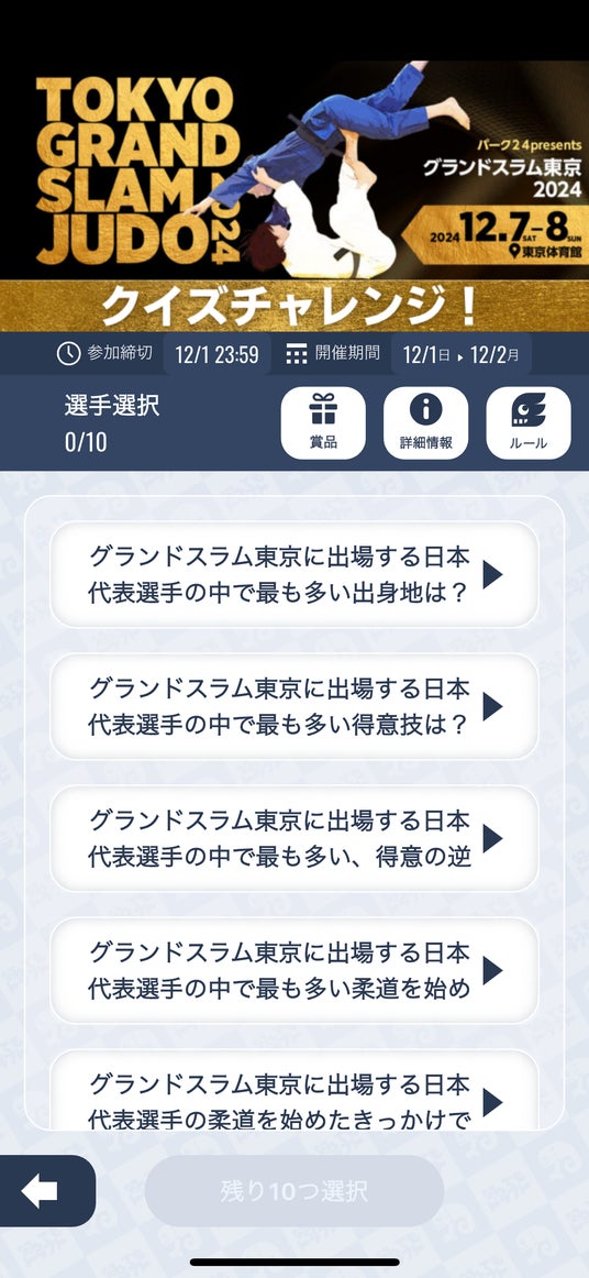 内 容:『パーク24presentsグランドスラム東京2024』公式サイトで案内されている選手情報や大会情報から9つのクイズを出題(+賞品当選の場合の参加希望日)