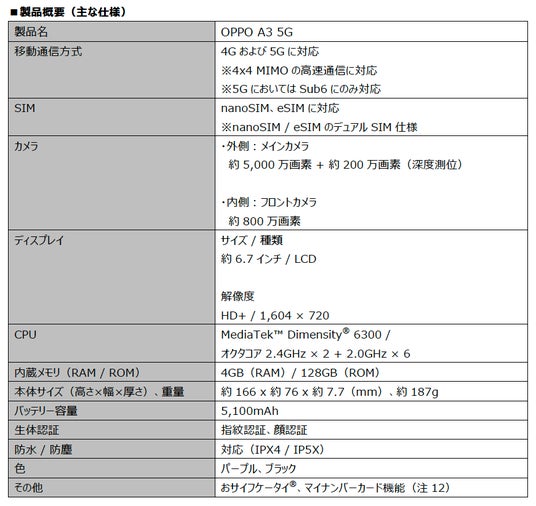 ■「OPPO A3 5G」製品ページ