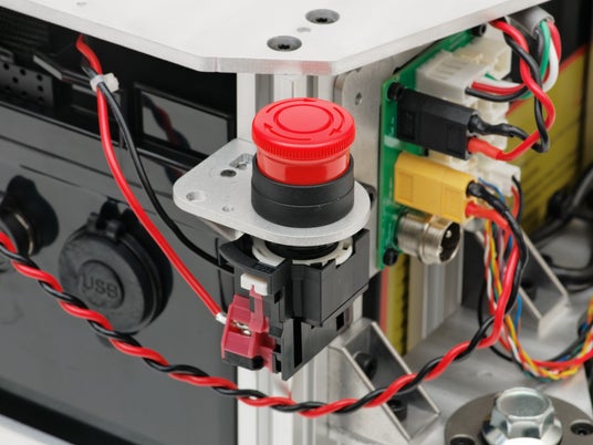 本製品には「非常停止スイッチ」を標準搭載しています。また、非常停止スイッチの取り付け位置は、配線の長さや他機器との緩衝の問題がない限りは自由に変更可能です。実運用の状況や、追加する拡張機器の搭載状況などに応じ、ユーザー側で付け替えて使用することを想定しています。