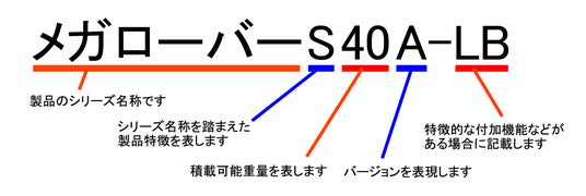 製品特徴を表すアルファベットについて、「メガローバー」では通常「F」を採用していますが、本製品メガローバーS40A-LBは車輪構造が従来のメガローバーとは異なる派生版であるため、「S」としています。