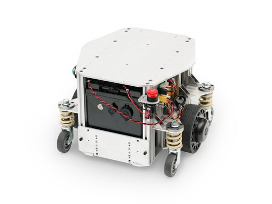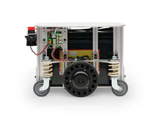 メガローバーS40A-LBは、ヴイストン株式会社製の研究開発用台車ロボットシリーズの中核モデルである「メガローバーVer.3.0」の派生モデルです。従来比で容量が約5倍となるバッテリーを搭載したほか、2個の駆動輪を車体の前後中央に搭載することで、車体の中心を軸としたその場旋回が可能となりました。