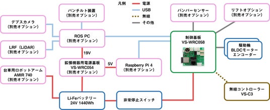 台車ロボットにROSで制御するための環境構築済みPCを取り付ける、本体注文時の有償オプションです。拡張機器用電源基板オプション VS-WRC054が別途必要です。