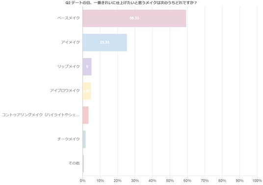 デートの日、一番きれいに仕上げたいと思うメイクは?という質問に対しては〈ベースメイク〉が59.3%と最も高い回答率で、他のメイクよりもベースメイクを重視している人が多いことがわかりました。