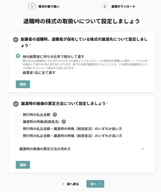 個々の状況に合わせて条件の設定が可能です。退職時の株式持ち出しの条件や、持ち出し可能数の設定、競業禁止規定など、創業者間契約で設定すべき条件を網羅的に設定可能です