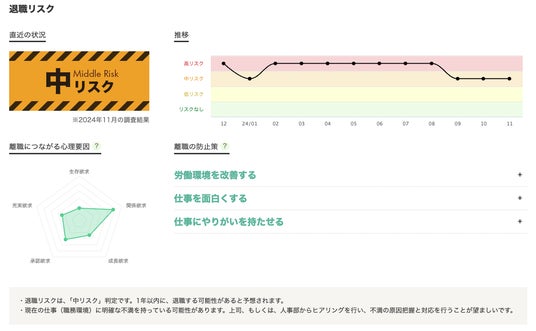 パルスアイでは、退職意向に与える影響を学習・モデル化して、AIにより従業員個々人の退職リスクを判定します。退職リスクの高い従業員をタイムリーに把握することで、離職防止に向けたフォローを適時に行うことができ、離職率低下に効果を発揮します。今回、新機能として、従業員個別の回答結果をAIが分析し、「離職につながる心理要因」と「離職の防止策」を提示するようになりました。