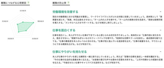 「離職につながる心理要因」は、従業員が組織で働き続ける上で重要となる「生存欲求」「関係欲求」「成長欲求」「承認欲求」「充実欲求」の5つに分けて、その充足度を示します。スコアが低いほど、離職につながる原因となります。また、「離職の防止策」は、本人の項目別満足度の状況、働く上での重要事項、離職につながる心理要因の結果から、離職の防止策として効果が期待できる打ち手の上位3つを示します。