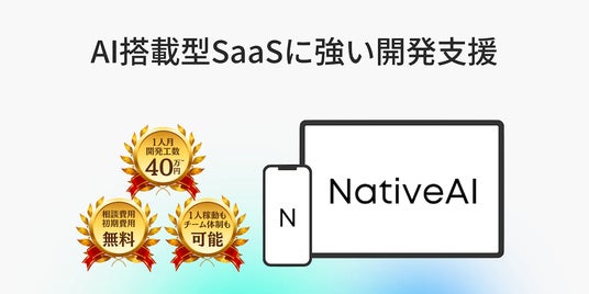 NativeAI(URL: https://nativeai.io/ )は、AI搭載型SaaSに強い開発支援サービスです。AIを用いた最新の開発手法やチーム体制で行うことで、一般的な費用の「半分」程度で、従来よりも品質の高いプロダクト開発を実現することができます。