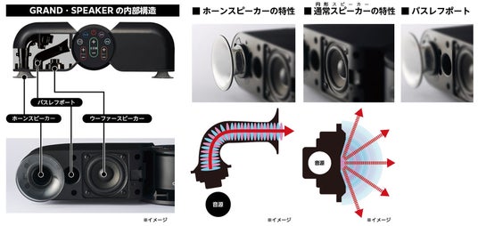 ◆テレビの音を遠くまで届けるホーンスピーカーと通常スピーカーのハイブリッド構造