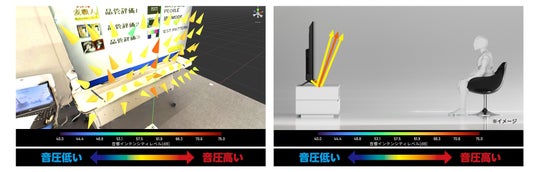 一般的に、高齢者は加齢に伴い耳が聞こえにくくなります。本製品を開発するにあたり、早稲田大学内ベンチャー企業である、株式会社INSPIREIが開発した音の方向性と音量を可視化できる「SOUND INTENSITY SCANNER AR」で実験確認したところ、最近のテレビ※のスピーカーは画面優先でスピーカーが下向きに取り付けられている製品が多く、スピーカーから出た音はテレビ台に反射され、上方向に放射し、離れた場所に音が真っすぐに届かないために、音量を上げないと高齢者にとって聞こえにくいことがわかりました。