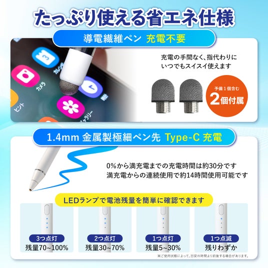 細かい文字入力やイラストの細かい部分までしっかり描けるように、1.4mmの極細金属製ペン先を採用しています。耐久性に優れ、摩耗しにくいため、長時間使用してもペン先の交換の必要はほとんどありません。また、Type-C充電対応で、わずか約30分でフル充電が完了し、約14時間の連続使用が可能です。