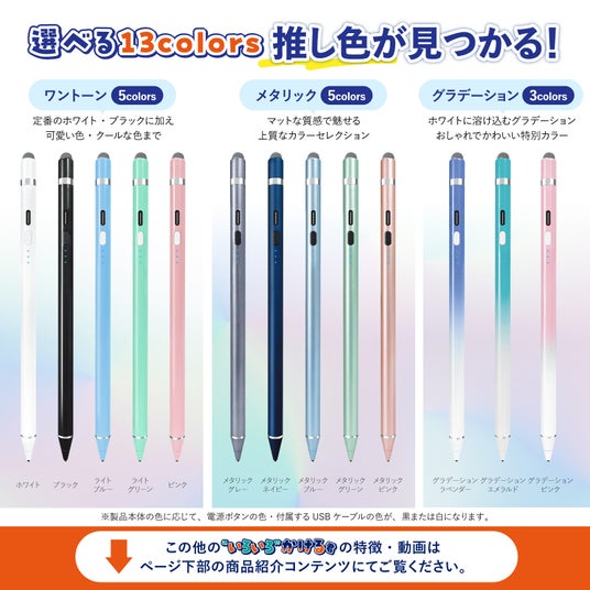 「いろいろかける君」は、カラーバリエーションが豊富で、全13色からお好きな色を選べます。ワントーンカラー(5色)、メタリックカラー(5色)、グラデーションカラー(3色)から選べるので、あなたのライフスタイルや好みに合わせて、ピッタリのタッチペンを見つけることができます。
