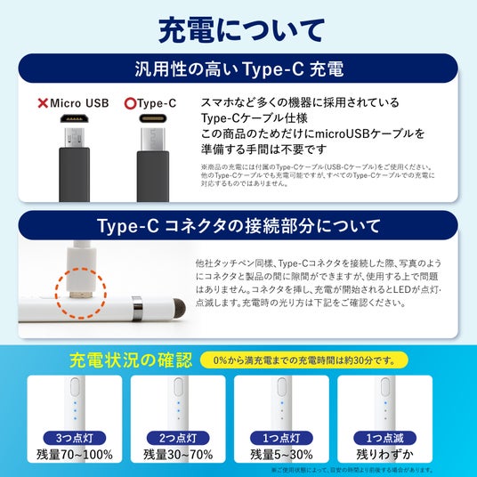 充電時間はわずか30分で、約14時間の連続使用が可能です。また、充電状況はLEDランプで簡単に確認できるので、電池残量の確認もとても簡単です。充電は、汎用のType-Cケーブルで行うことができ、特別なケーブルを準備する必要はありません。
