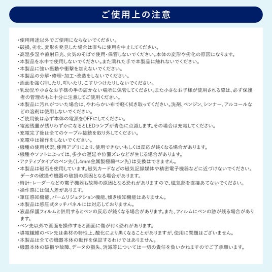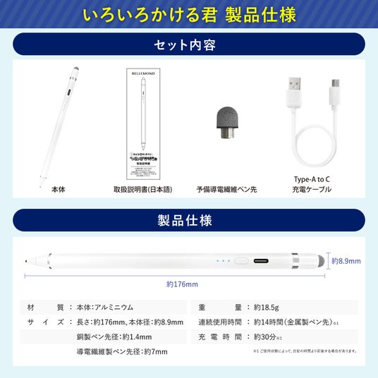 セット内容:本体×1、Type-A to C充電ケーブル×1、取扱説明書(日本語)×1、導電繊維ペン先(予備1個)