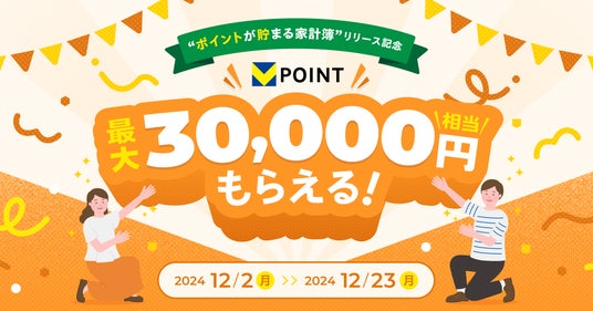 マネーフォワードホーム株式会社は、2024年12月2日(月)より、『マネーフォワード ME』の新機能「ポイントが貯まる家計簿」の提供開始を記念し、最大30,000円相当のVポイント※1がもらえるキャンペーンを開始します。Vポイントは三井住友カード株式会社(本社:東京都江東区、代表取締役社長:大西 幸彦、以下「三井住友カード」)とCCCMKホールディングス株式会社(本社:東京都渋谷区、代表取締役社長 兼 CEO:高橋 誉則、以下「CCCMKHD」)が提供する共通ポイントサービスです。