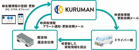 煩雑な資格や車両の情報管理にかかる業務負担を大幅に軽減するとともに、メール通知機能を活用した資格更新の促進と徹底を図るなど、「KURUMAN」を通じた軽貨物運送業界の情報管理業務の効率化と水準向上を目指します。