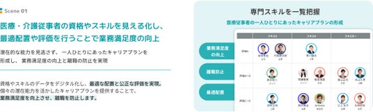 医療・介護従事者が保有する資格やスキルを見える化することで、データをもとにした最適配置や評価を行うことが可能です。これにより潜在的な能力を見逃さず、一人ひとりにあったキャリアプランを形成し、業務満足度の向上と離職の防止を実現いたします。