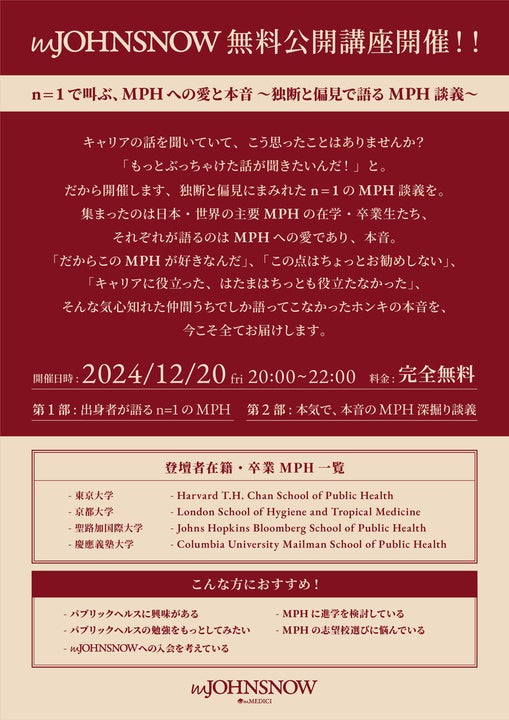 研究者・医療職のスペシャリストによって設立され、一流の知のプラットフォームを提供しているmMEDICI株式会社(代表取締役:廣瀬 直紀、以下「当社」)は、医師や医学研究者などのスペシャリストとその卵が約700名集う日本最大規模のパブリックヘルスオンラインスクールmJOHNSNOWにて、2024年12月20日(金)に、無料公開講座、「n=1で叫ぶ、MPHへの愛と本音~独断と偏見で語るMPH講義~」を開催いたします。