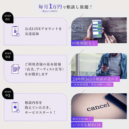 ソゾムは、「LINE公式アカウントを通じたチャット・オンライン相談」「初月無料、2ヶ月目以降は月額1万円(税込11,000円)で1ヶ月単位で利用可能」など、インディペンデントアーティストが気軽に利用できる内容・費用のサービスとなっています。