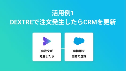 DEXTREで注文が発生したらその情報をSalesforceやHubSpotなど、すでに社内でお使いのCRMに自動で登録するフローです。