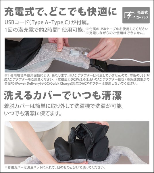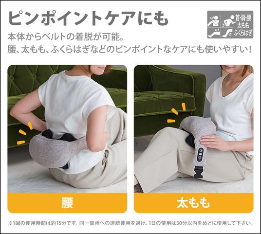 また、伸縮ベルトは着脱が可能で、腰や太もも、ふくらはぎなどもピンポイントでケアすることができます。着脱カバーは簡単に取り外して洗濯機で洗うことができますので、清潔に保つことができます。