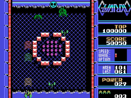 ゲームはトップビューを採用。プレイヤーは自機を操作して敵と戦い、一定数の敵を破壊すると次のステージへと進めます。ただし、その際にはルート選択や自機のパワー配分などもあり、他のシューティングでは味わえない戦略性が楽しめます。特にパワー配分は重要で、これはスピードやショットなどにパワーを振り分けるというものなのですが、ここ一番でパワー不足にならないよう、先を見越して節約をしておくなどの工夫が必要になります。