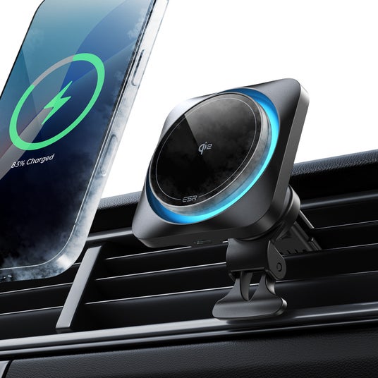 ESRの15W MagSafe車載充電器は、CryoBoost(TM)冷却技術で高速充電を実現し、iPhone 15 Pro Maxを2時間7分でフル充電可能。18個の強力磁石で1,600gの吸着力を発揮し、悪路でも安定。通気口クリップとダッシュボード固定の2通りで設置できます。