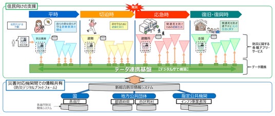 そこでデジタル庁は、平時、切迫時、応急時、復旧・復興時という災害のフェーズごとに求められるサービスとそれに必要なデータの抽出等を行い、様々な防災アプリ等の間でデータの連携が図られるようデータ連携基盤の設計・構築を進めることになりました。