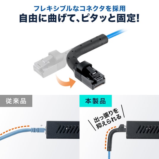 コネクタ部を上下左右に曲げて固定できるため、狭いスペースや複雑な配線にも簡単に対応。サーバールームやデスク周りの整理が格段に楽になります。しかも内部に補強材を追加しているため、曲げても安心して使用可能。