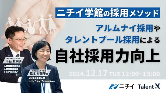 株式会社TalentX(本社:東京都新宿区、代表取締役社長:鈴木貴史)は、株式会社ニチイ学館(本社:東京都千代田区、代表取締役社長:森 信介、以下「ニチイ学館」)をゲストにお招きして、「ニチイ学館の採用メソッド~アルムナイやタレントプールを活用した自社採用力向上~」をテーマにお話しいただく採用マーケティングセミナーを12月17日(火)に開催いたします。